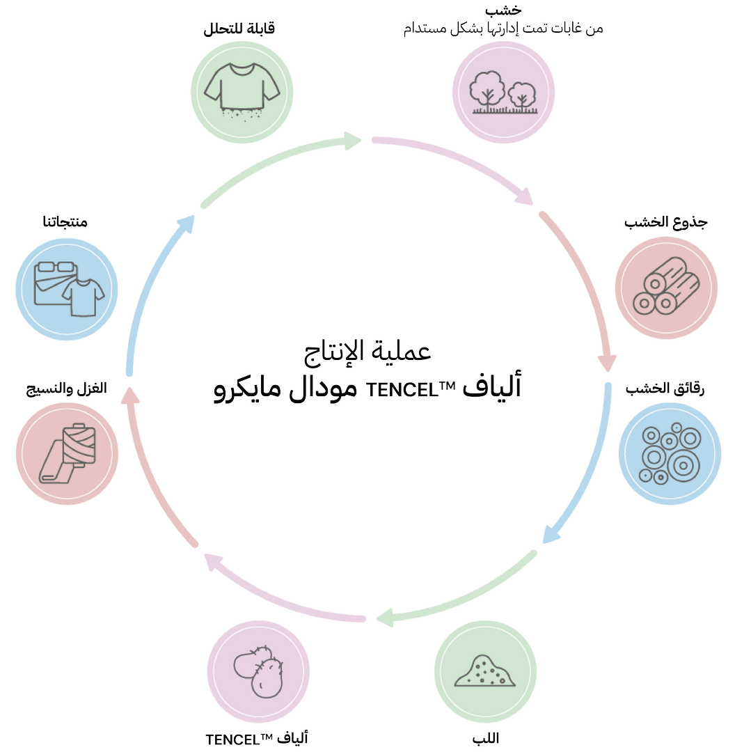 *ألياف TENCEL™ - مقارنةً بالمودال العادي (غير المنسوب لعلامة تجارية). تستند النتائج إلى معايير تحليل دورة الحياة (ISO 14040/44) ومتوفرة عبر Higg MSI (الإصدار 3.8).