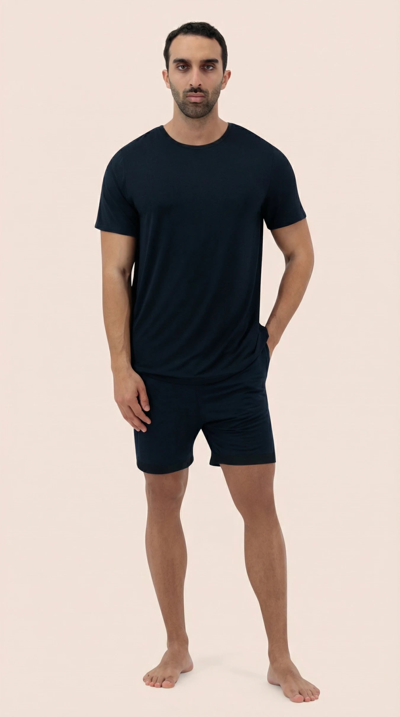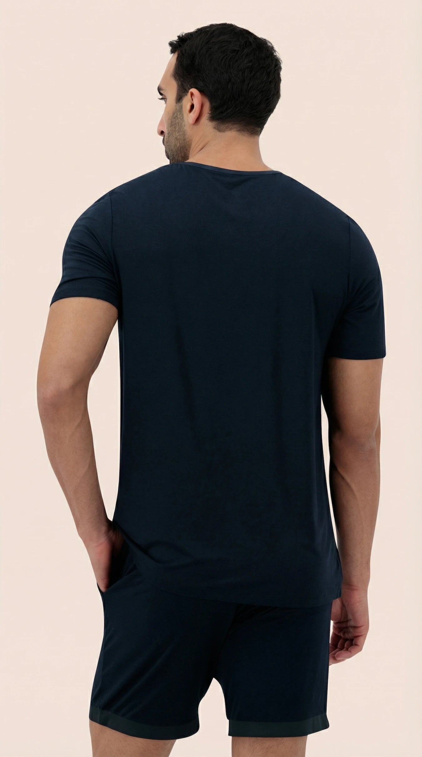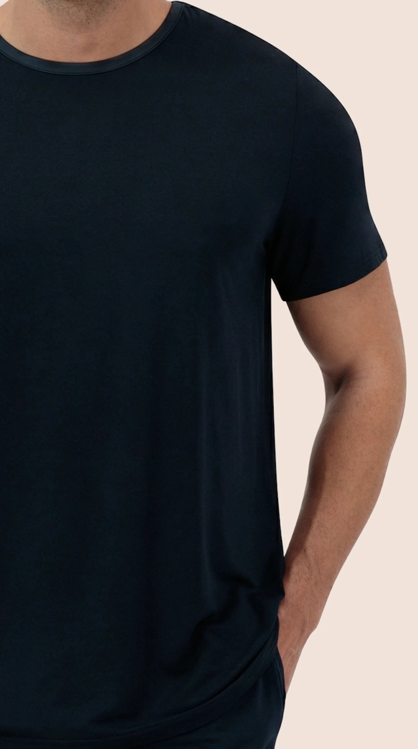 The Men's De-stress Pyjama T-Shirt is made from sustainable TENCEL™ Modal x Micro fibers. This T-Shirt is 2x softer than cotton and more absorbent than cotton, providing an exceptionally smooth touch for unmatched comfort. The fabric's temperature regulating and breathable properties allow for a restful night’s sleep. Pair them with the Unwind Shorts or Breezy Pants to create your ideal cozy pyjama set.